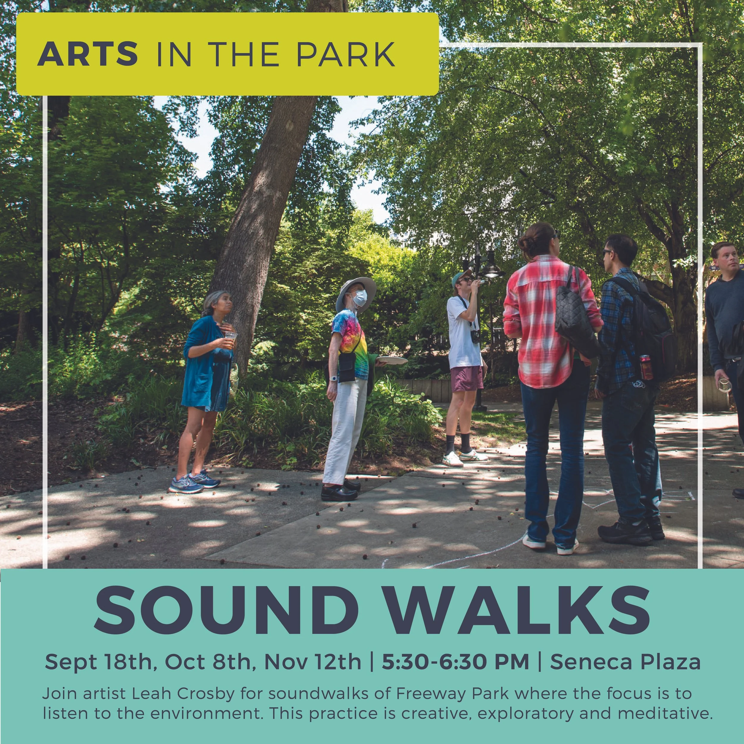 Join artist Leah Crosby for a series of soundwalks in the park this fall. A soundwalk is a walk where the focus is to listen to the environment. This practice is creative, physical, exploratory, and meditative. Join us to practice Deep Listening techniques, learning and reflecting on new ways to engage with the sonic landscape of Freeway Park.